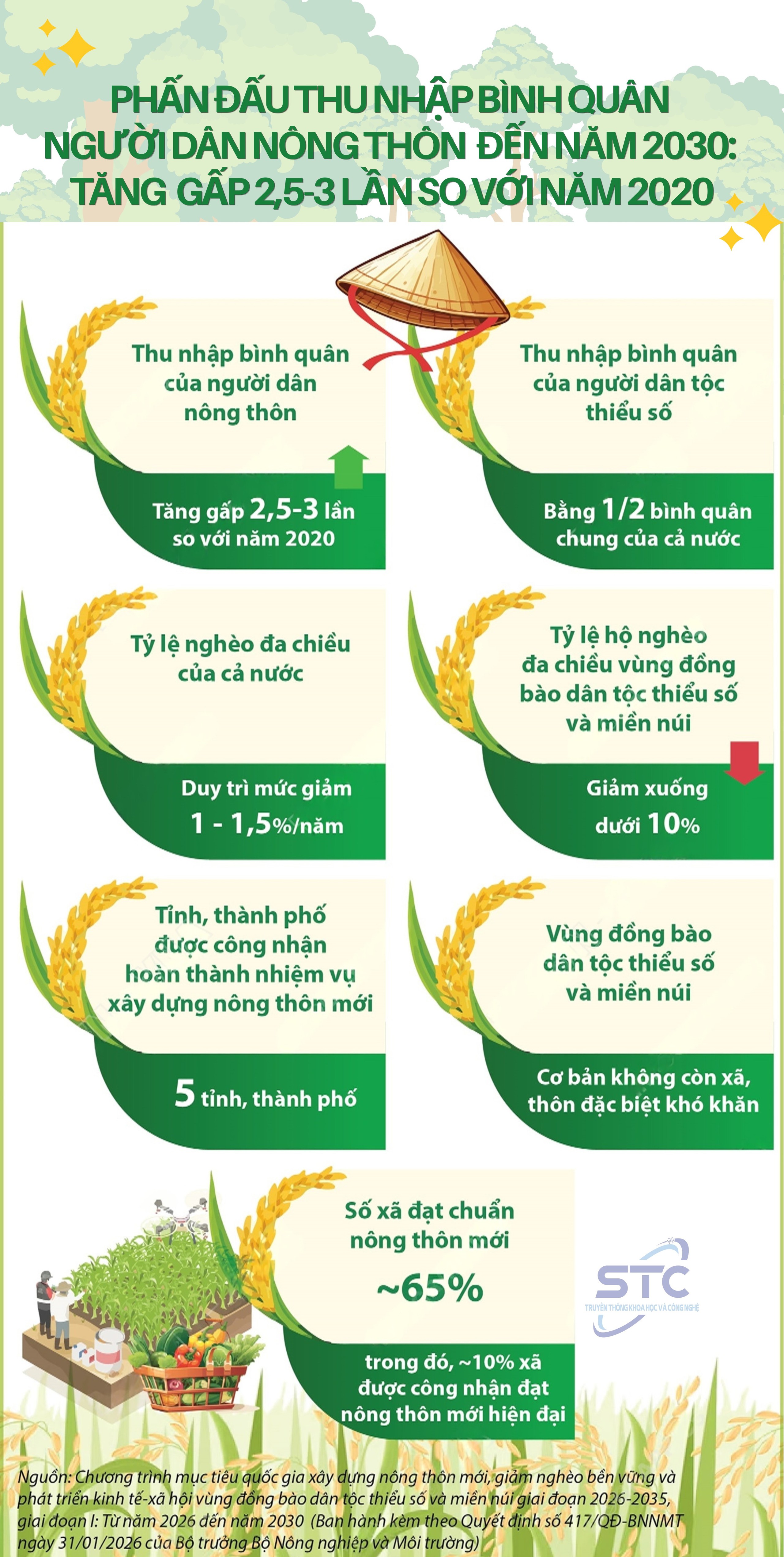 Quyết định số 417/QĐ-BNNMT ngày 31/1/2026 của Bộ Nông nghiệp và Môi trường phê duyệt Chương trình mục tiêu quốc gia xây dựng nông thôn mới, giảm nghèo bền vững và phát triển kinh tế - xã hội vùng đồng bào dân tộc thiểu số và miền núi giai đoạn 2026 - 2035, giai đoạn I: Từ năm 2026 đến năm 2030, Mục tiêu tổng quát của Chương trình là: Xây dựng nông thôn mới hiện đại, giàu đẹp, bản sắc, bền vững, gắn với đô thị hóa và thích ứng biến đổi khí hậu. Phát triển toàn diện vùng đồng bào dân tộc thiểu số và miền núi. Thực hiện giảm nghèo đa chiều, bao trùm, bền vững, bảo đảm bình đẳng giới và an sinh xã hội. Phát triển kinh tế nông thôn theo hướng xanh, tuần hoàn, sinh thái,