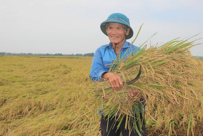 Nông dân trồng lúa hữu cơ vui mừng vì được mùa.